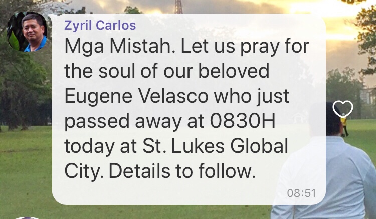 A very sad day today! I am still in shock. Eugene is a neighbour who is a health conscious buff. I can see him taking daily walks with his wife, Ester, around our neighbourhood in the wee hours of the morning, as I am leaving for work to evade the traffic rush hours. Jing, as we call Eugene, passed away a few minutes ago of gastric bleeding at St. Luke’s hospital. I remember this email loop with jest.