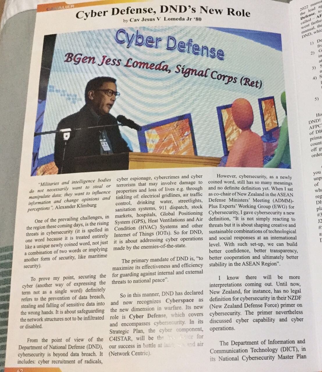 I also keep on repeating in my lectures: in any warfare, may it be in land, sea, air and now cyber, we have to identify first our own forces before engaging in a fight. In land, it is the Army; in sea, it is the Navy; in the air, it is the Air Force; and in cyber, we have the Signal Corps. DND has all these forces and it is prepared to defend the country anytime anywhere, may it be in land, sea, air and even in CYBERSPACE. All ready to fight and win!
