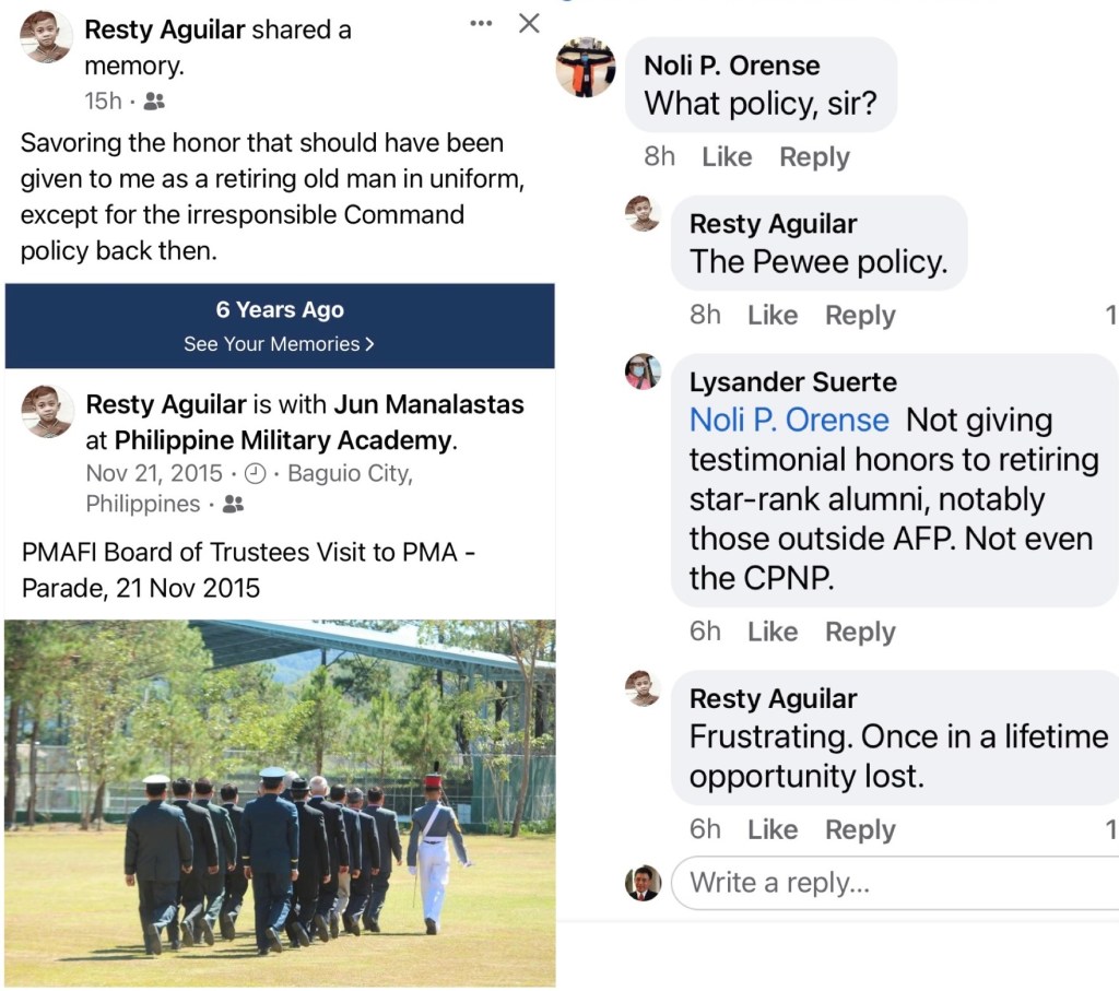 I envy those one-star generals who did not suffer the pain and regrets, who got their stars before or after the term of the Superintendent that I mentioned. So when a mistah became the Superintendent of PMA, he scheduled and rendered testimonial parades to all classmates even the retirement is still far away.