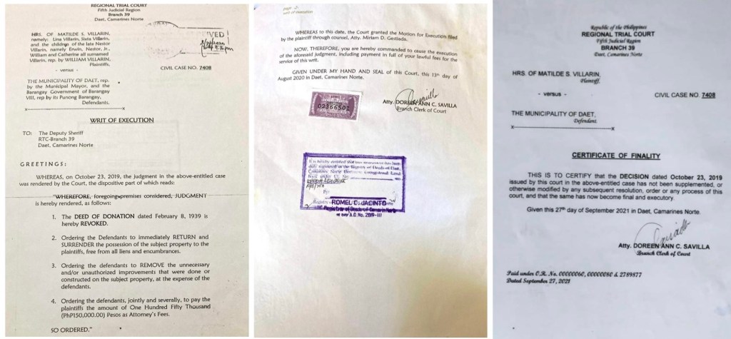 Nevertheless, Barangay Captain Moya brazenly moved in our property that year. He started, at first, to build temporary shelters. The Barangay and municipal government changed hands. When my mother, Lina Lomeda, filed the cancellation of the Deed of Donation at the RTC, the mayor was Tito Sarion and the Barangay Captain was Edwin Sayson; the two became the accused. The case took 17 years to have the deed of donation be revoked but the structures inside the lot grew vastly, with a hall. When settled on 23 October 2019, the barangay captain was already William Villrarin, one of the heirs of Matilde.